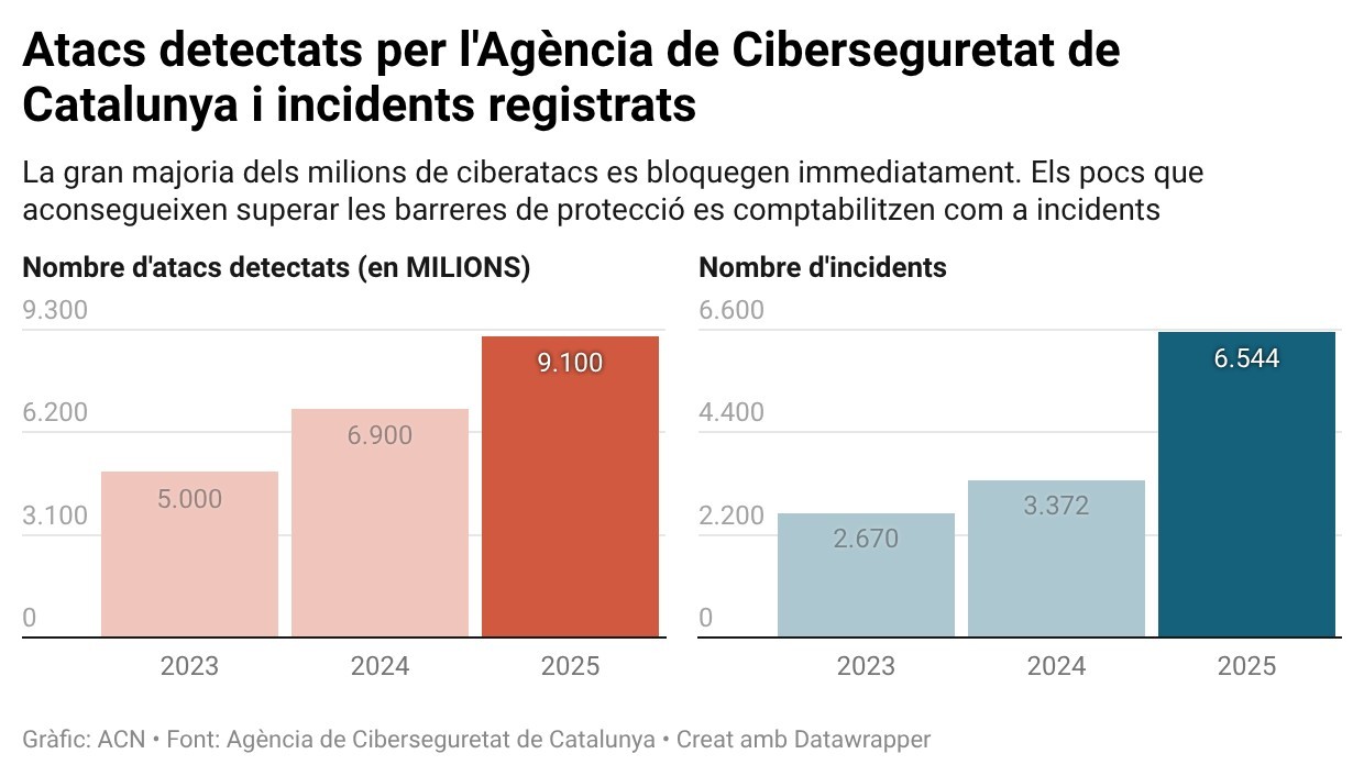 L’Agència de Ciberseguretat de Catalunya va gestionar 6.544 incidents de seguretat el 2025, una xifra que gairebé duplica els 3.372 registrats l’any anterior. L’increment reflecteix tant l’augment global de les ciberamenaces com la millora en les capacitats de detecció de l’organisme.
